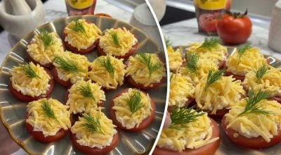 Skær tomaterne i cirkler. Bland revet smelteost, mayonnaise, hakket hvidløg, peber og dine yndlingskrydderier. Læg fyldet på tomatskiverne, og drys med revet ost. Pynt snacken med dild.