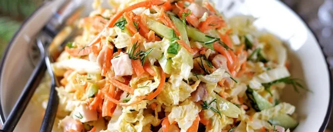 - Kom pekingkål, gulerødder, agurk, hvidkål og grønt i en skål, salt, bland forsigtigt, hæld dressingen over, og bland igen.